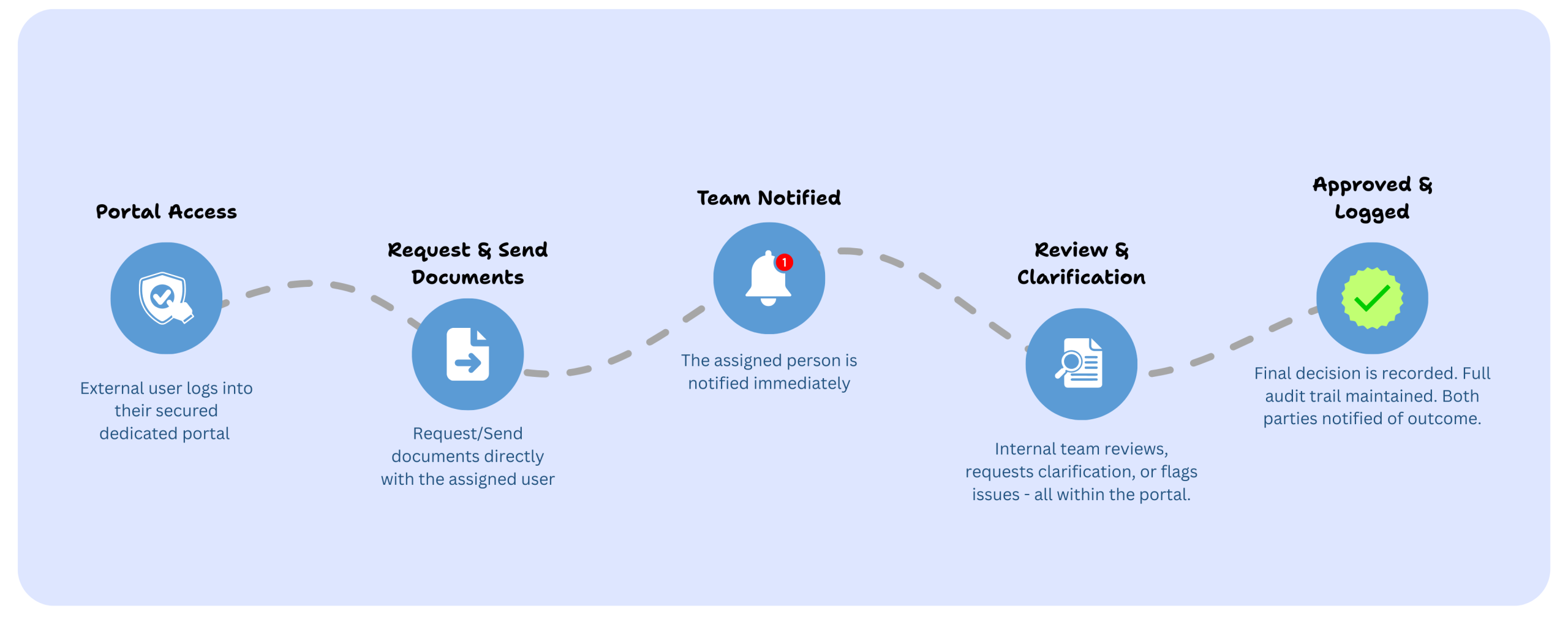 Documents are uploaded into predefined locations following document type classification. When clarification is required, internal teams request it through the portal - and external users receive notifications and respond in the same interface, keeping the full thread in one place.