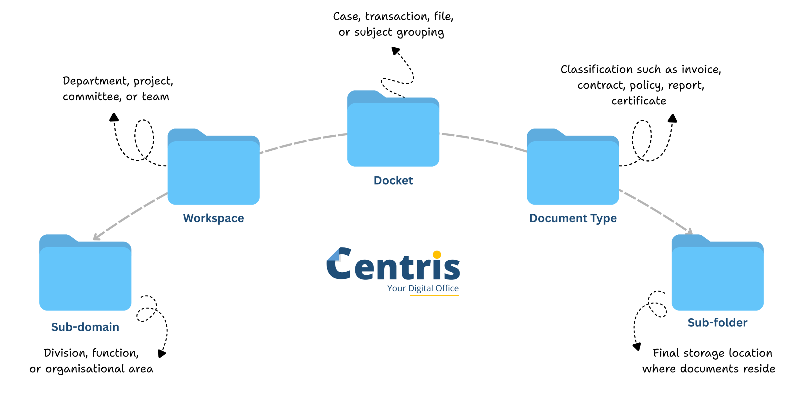 - Centris introduces structure and discipline by ensuring documents are stored in predictable locations, follow a common organisational logic, and are protected by access rules.